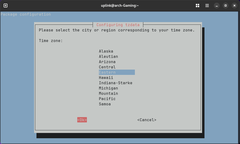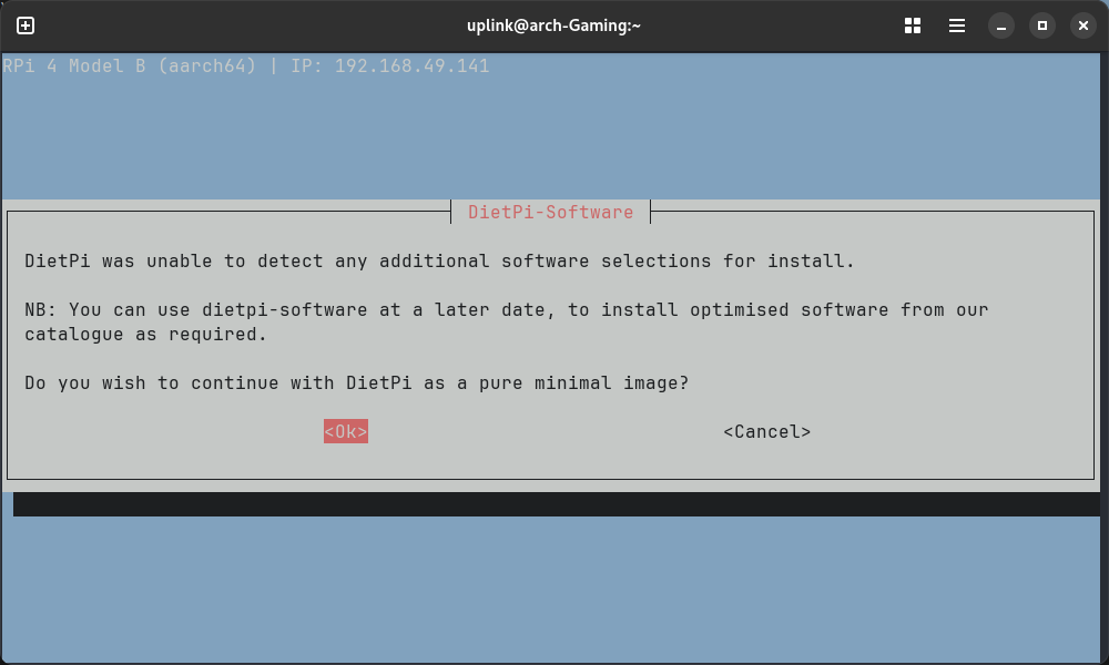 Since I didn’t choose to install anything, I get a warning about setting up just a minimal image. Navigate to “Ok” and hit Enter.