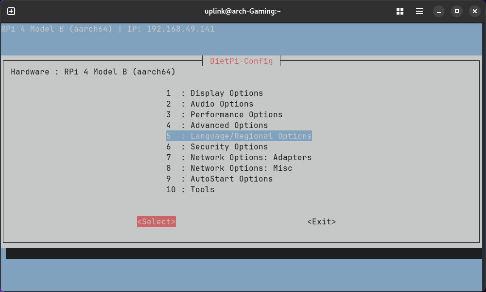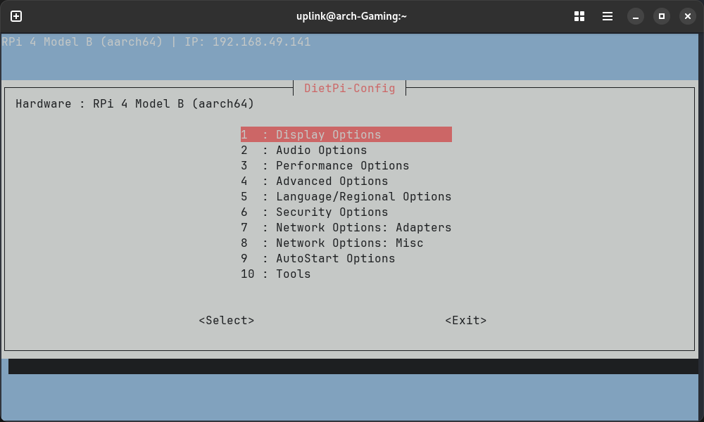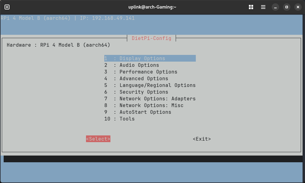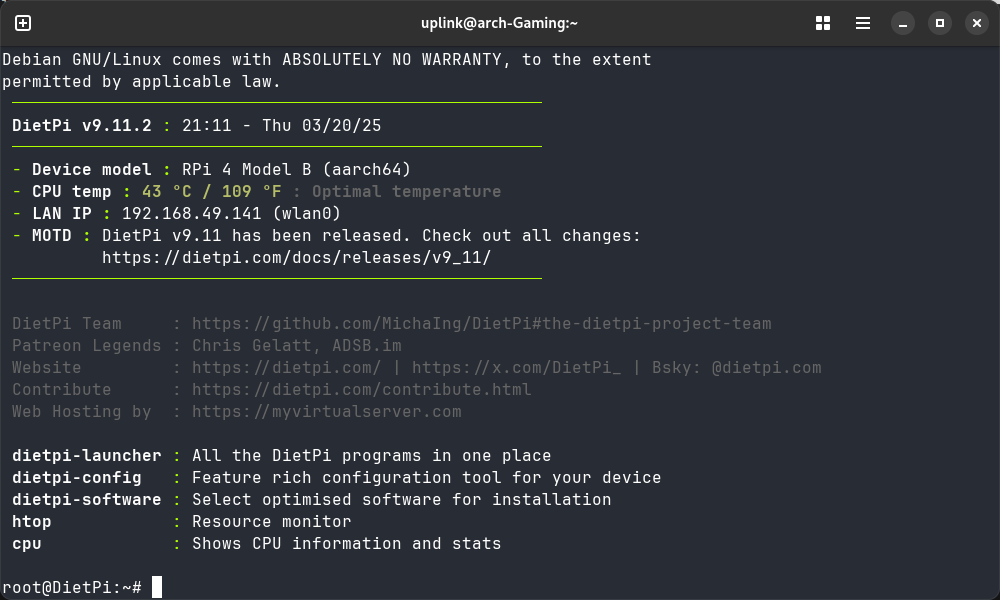 A word of warning, you are dropped in the system as the root user which is dangerous to run commands in. I recommend dropping down to the normal user “dietpi” by running
