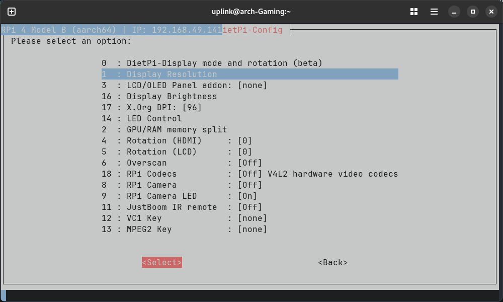 - Go to “Display Options” hit Tab to hightlight “Select” and hit Enter.