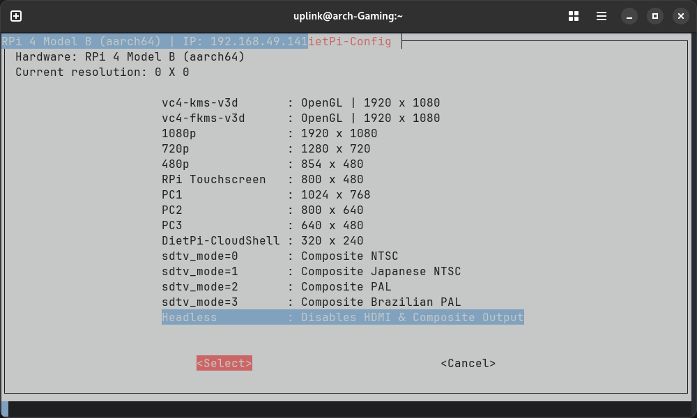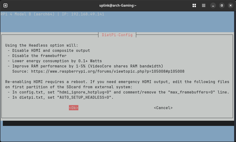 - You will get a info panel showing what using Headless will do. Big take aways it will lower energy consuption by a marginal amount and improve RAM performance. Also with instructions on if you need emergency HDMI output. Select “Ok” and Enter.