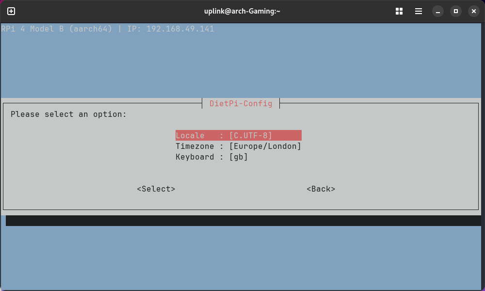 - Keyboard is setup the same way with the default being “gb” for Great Briton. If you are like me and using this setup headless, then there is no need or worry about changing it since there is no keyboard plugged into the DietPi to change.