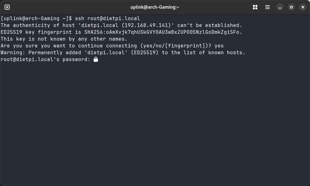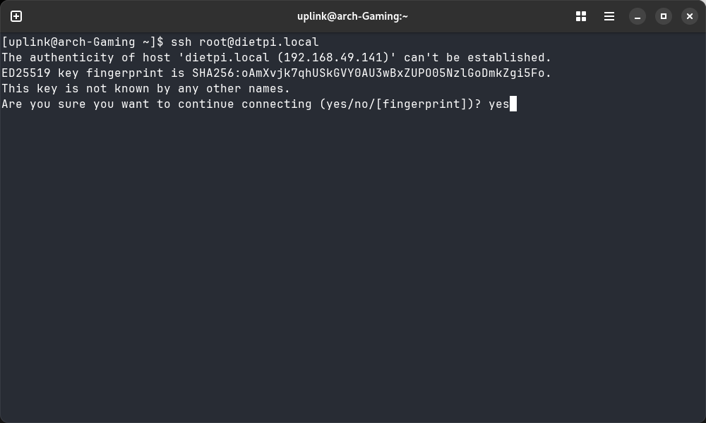 - This is where the fun really begins! We get to SSH into our new system. Since this is the first time using SSH to connect to this system, you will receive a warning asking “Are you sure you want to continue connecting?” Answer “Yes” and hit enter.