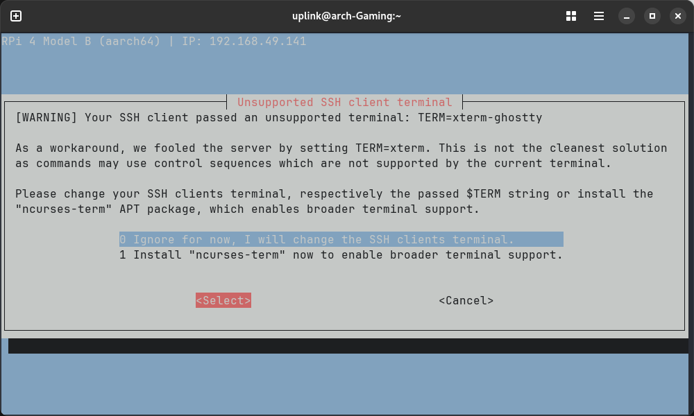 If you get a prompt “Unsupported SSH client terminal” use your arrow keys to select “0 Ignore for now, I will change the SSH clients terminal.” Hit TAB to highlight “Select” and hit Enter.