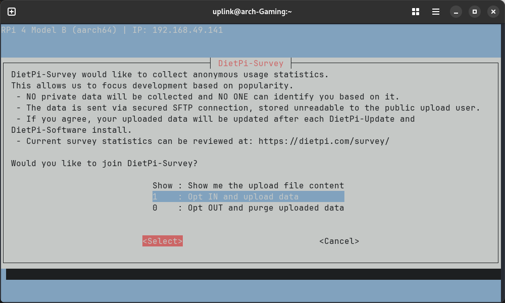 Once the updates are downloaded and installed, you will get a prompt for “DietPi-Survey”. What that does is each time there is a “DietPi-Update” or “DietPi-Software” install, it uploads those programs to the team so they can focus development on programs that are being used. I highly recommend Opting In and helping support the team by selecting “1 : Opt IN and upload data.” Hit TAB to highlight “Select” and hit Enter. You can see their current collection of survey data at https://dietpi.com/survey/