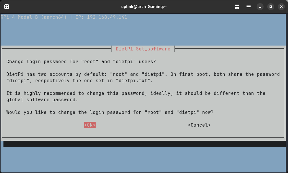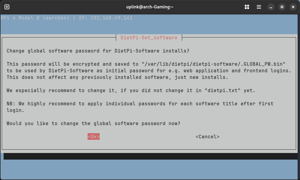 You will get a prompt asking you to change your global software password if you didn’t change it in the dietpi.txt file. Recommended