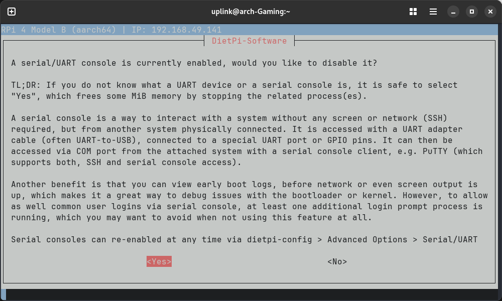 The follow-up question will ask you if you want to disable serial/UART console. Unless you plan on using it, I recommend selecting “Yes” and hitting Enter to disable it.