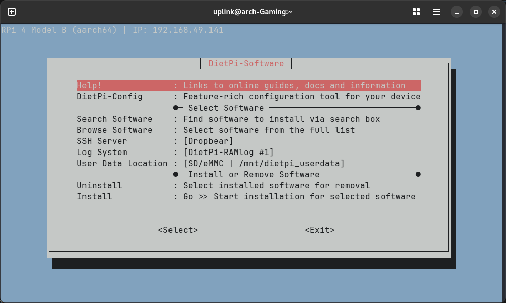 You will then be at the main “DietPi-Software” screen where you can choose what software you would like to install by navigating to “Browse Software” to take a look at the full range of optimized packages for DietPi for your system. For the purposes of this guide, I won’t install anything extra but regardless, when you are done, navigate down to “Install” and hit TAB to highlight “Select” and hit Enter.